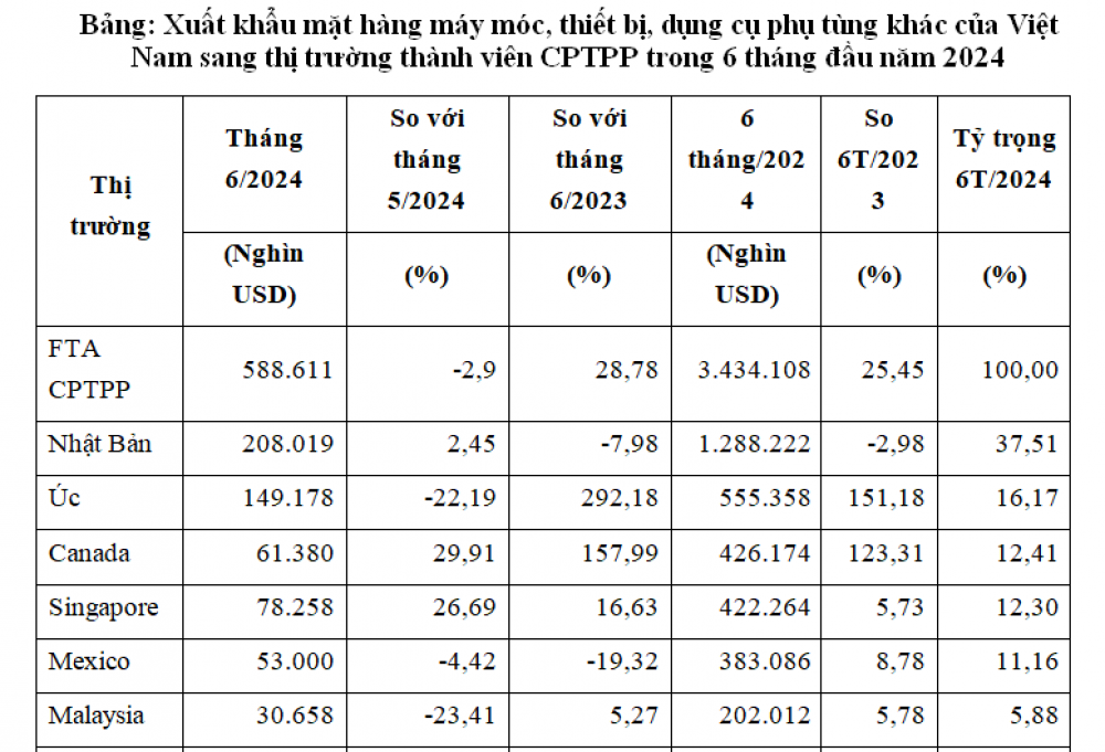 Riêng đối với thị trường CPTPP, trong tháng 6/2024, kim ngạch xuất khẩu máy móc thiết bị phụ tùng sang các thị trường CPTPP đạt 588,6 triệu USD, giảm 2,9% so với tháng trước và tăng 28,78% so với tháng 6/2023. Tính chung trong 6 tháng đầu năm 2024, kim ngạch xuất khẩu sang khối thị trường này đạt 3,43 tỷ USD, tăng tới 25,45% so với cùng kỳ năm trước và chiếm 14,8% tỷ trọng trên tổng xuất khẩu nhóm hàng của Việt Nam, cao hơn so với mức tỷ trọng 11,9% trong 6 tháng đầu năm 2023.